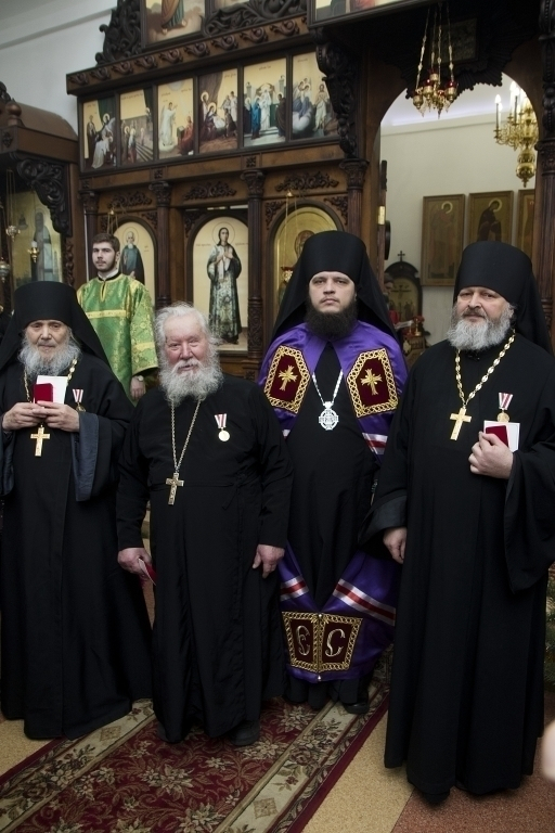 Затем Архипастырь вручил юбилейные медали Русской Православной Церкви «В память 100-летия восстановления Патриаршества в Русской Православной Церкви» иеромонаху Савве (Шукало), протоиерею Вячеславу Старцеву и иеромонаху Александру (Гончарову).